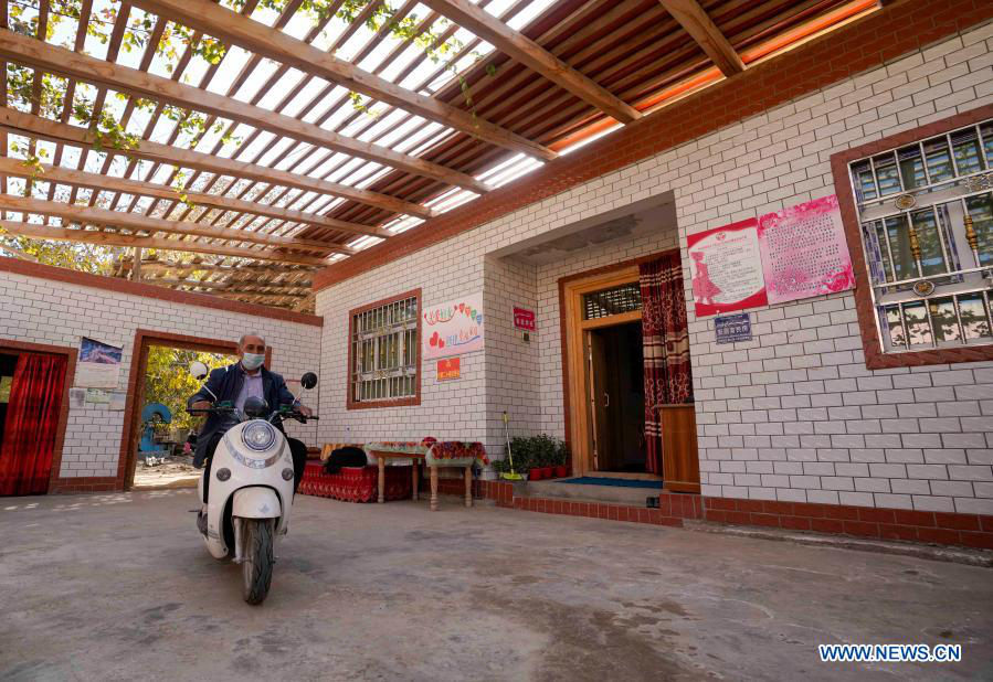 A villager rides past his house in Akesalayi Township of Moyu County, northwest China's Xinjiang Uygur Autonomous Region, Oct. 22, 2020. In a historic feat, northwest China's Xinjiang Uygur Autonomous Region has bidden farewell to absolute poverty. The last 10 impoverished counties in Xinjiang have managed to end absolute poverty, the regional government announced Saturday. The 10 counties, including Shache County, Moyu County and Akto County, are no longer impoverished counties by official standards, the local government said in an online statement. All the 10 counties are in southern Xinjiang, where the country's largest desert is located. Local people used to have limited access to stable income and public services due to the harsh natural environment and poor infrastructure. (Xinhua/Zhao Ge)