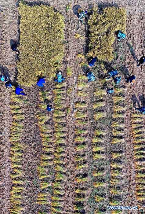 Aerial photo taken on Nov. 15, 2020 shows the skills competition for autumn harvest on rice paddies at Chunhua Village of Fuchun Neighborhood in Fuyang District of Hangzhou, east China's Zhejiang Province. A total of 24 groups from each village of Fuchun Neighborhood participated in the competition here Sunday. Participants need to compete in skills as cut rice, thresh rice, put rice into sacks and bind the straw. (Xinhua/Xu Yu)