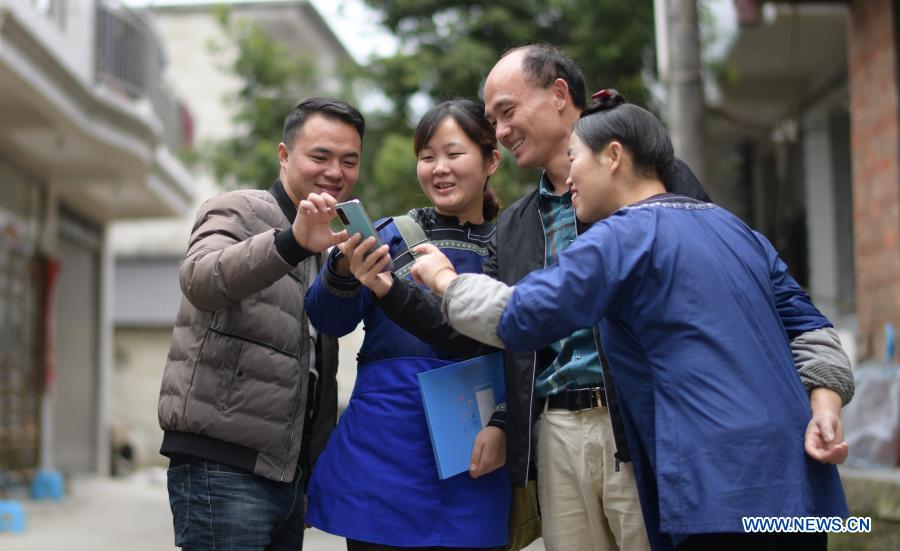 Liu Yuan(2nd L), a primary-level poverty relief official, talks with cadres and local villagers in Balu Village of Rongjiang County, Qiandongnan Miao and Dong Autonomous Prefecture, southwest China's Guizhou Province, Nov. 16, 2020. Liu Yuan, 32, has been working as a primary-level poverty relief official in Balu Village of Rongjiang County since Nov. 2019. In her daily work, she tried her best to solve practical problems for local villagers, including recommending jobs for the unemployed, helping relocated households torn down their shanty houses, and taking care of left-behind children and seniors in the village. She devoted herself in the poverty relief work here and gained trust and respect from local villagers. (Xinhua/Yang Ying)