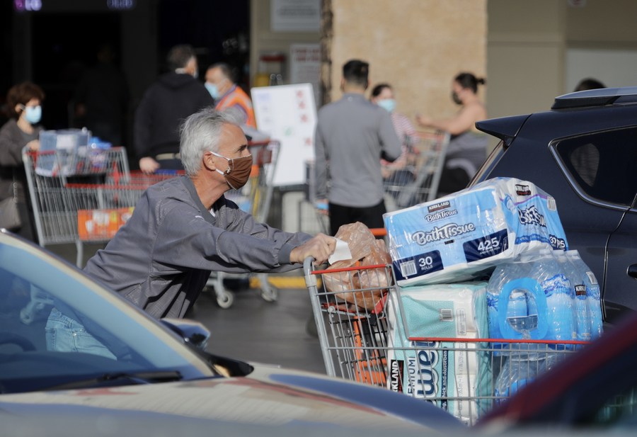 A consumer pushes a shopping cart at the parking lot of a Costco Warehouse in Los Angeles, the United States, on Nov. 20, 2020. (Xinhua)