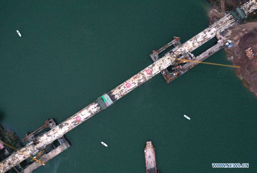 Aerial photo taken on Nov. 25, 2020 shows the Pengxi River multi-track railway bridge under construction in Huangshi Township of Yunyang County, southwest China's Chongqing Municipality. Construction of the Pengxi River multi-track railway bridge made a breakthrough on Wednesday when two parts of the 741.6-meter long bridge were joined together. The bridge is a key project along the 818-kilometer Zhengzhou-Wanzhou high-speed rail line, linking China's southwest with the country's central and northern parts. (Xinhua/Wang Quanchao)