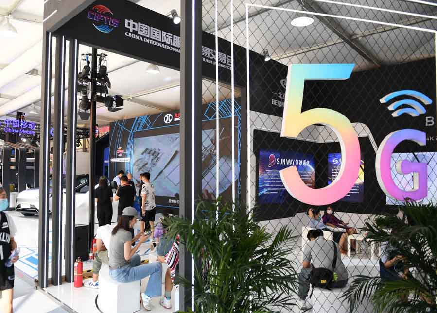 Photo taken on Sept. 5, 2020 shows a view of the 5G communication services exhibition area of the 2020 China International Fair for Trade in Services in Beijing, capital of China. (Xinhua/Zhang Chenlin)