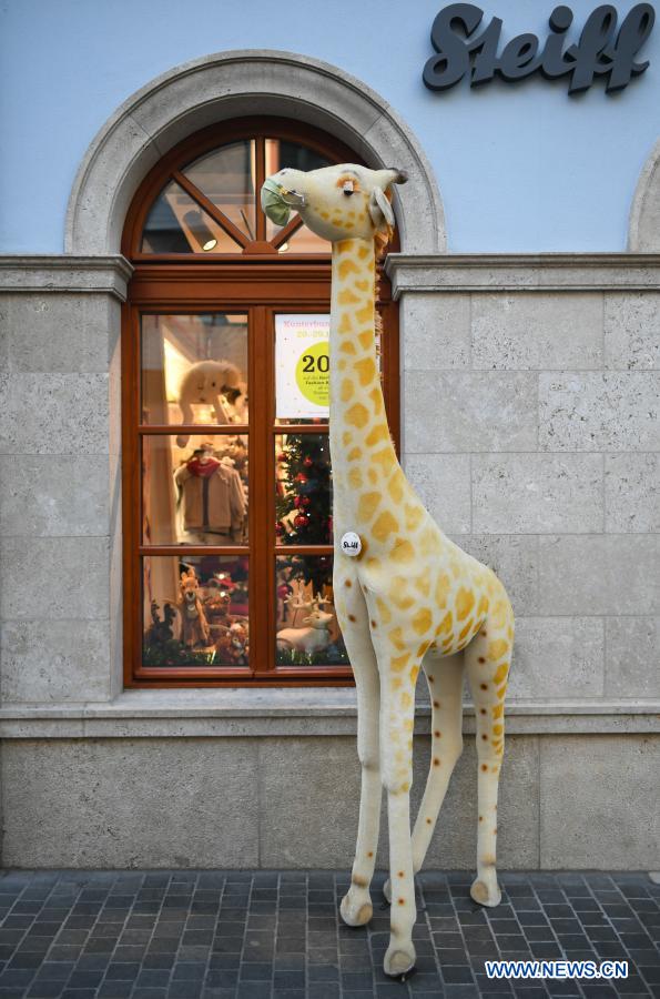 A masked giraffe doll is pictured in front of a children's clothing shop during COVID-19 pandemic in Frankfurt, Germany, Nov. 25, 2020. (Xinhua/Lu Yang)
