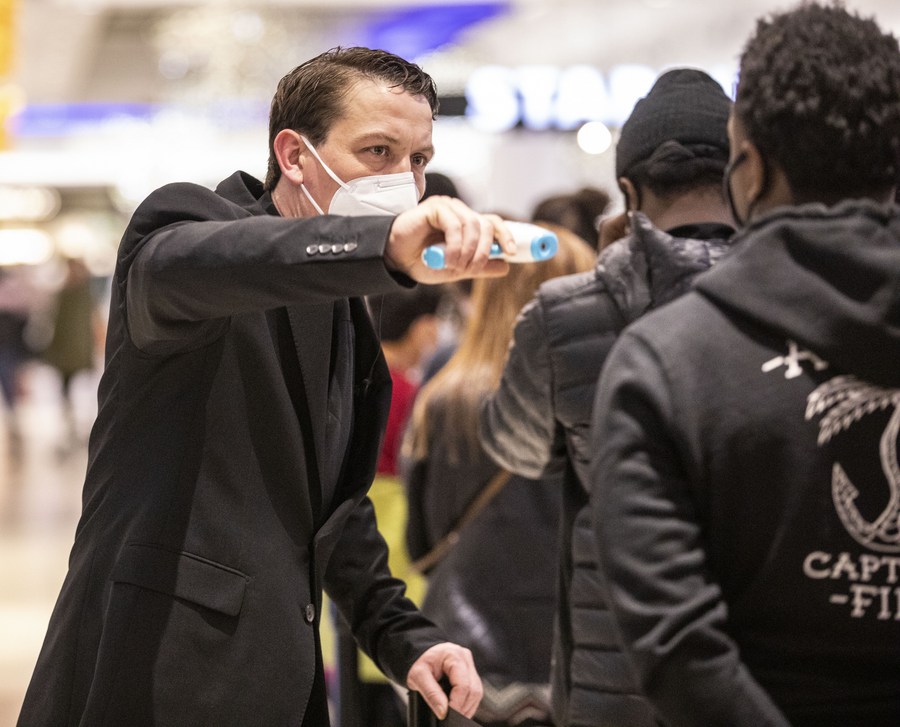 An employee checks a shopper's temperature during Black Friday shopping at Fashion Outlets of Chicago in Rosemont, Illinois, the United States, on Nov. 27, 2020. (Photo by Joel Lerner/Xinhua)