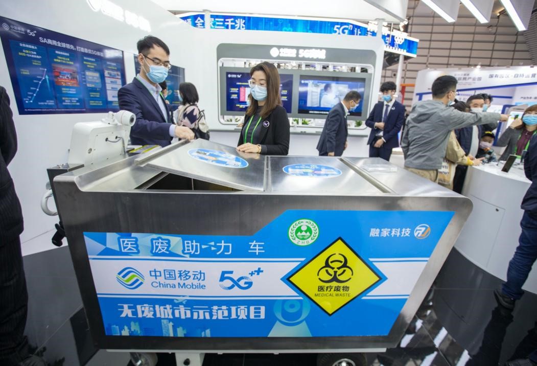 At the booth of China Mobile at the expo, a 5G-driven medical waste collection vehicle from Shaoxing, Zhejiang province, drew the attention of visitors.