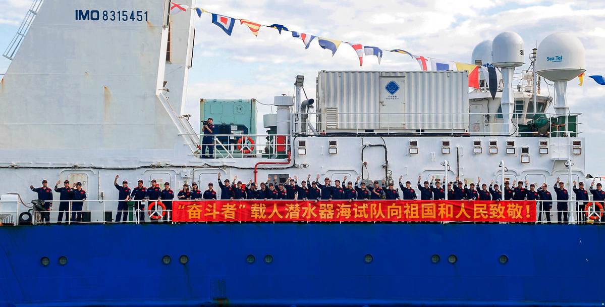 The crew of the scientific research ship Tansuo-1, celebrates on Saturday after China's new deep-sea manned submersible Fendouzhe, or Striver, completed its ocean expedition and returned to a port in Sanya, Hainan province. The submersible set a national record by diving to a depth of 10,909 meters in the Mariana Trench during the expedition. [Photo/China Daily]