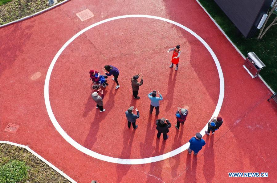 Aerial photo taken on Dec. 1, 2020 shows staff members organizing outdoor activities for seniors at a community elderly care center at the Suzhou Industrial Park in Suzhou, east China's Jiangsu Province. The elderly care center recently welcomed its clients back upon completion of a two-year renovation project that had fundamentally upgraded this facility from an ordinary nursing home. A professional management and operation team was also introduced to ensure quality services to the senior people living there. (Xinhua/Ji Chunpeng)