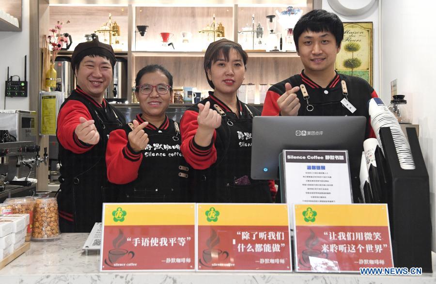 Staff members Yao Yixuan, Wang Lichao, Cao Ruihua and Li Tao (from L to R) pose for a photo in Silence Coffee in Xincheng District of Xi'an, northwest China's Shaanxi Province, Dec. 1, 2020. Silence Coffee, a coffee shop opened in Xi'an more than two months ago, is also a business incubator established for disabled people. Three of the four staff members in Silence Coffee are hearing-impaired baristas. They communicate with customers with sign language or typing on cellphone. Working on two shifts, all four members carried out routine work in the coffee shop including coffee making, baking, guest receiving and cleaning. Wang Lichao, manager of Silence Coffee, has learned sign language so as to better guide and "speak" to her colleagues. Wang always encourage them at work but also gets serious when problem occurs. Luo Tian, principal of Kaiyue Vocational Training School and person-in-charge of Silence Coffee, plans to recruit some new staff members every six month in the future, though the coffee shop is still operated at a loss. Since now the shop has become a leisure place for many, Luo hoped that more disabled people could get the opportunity to learn skills and socialize with others in Silence Coffee. (Xinhua/Liu Xiao)