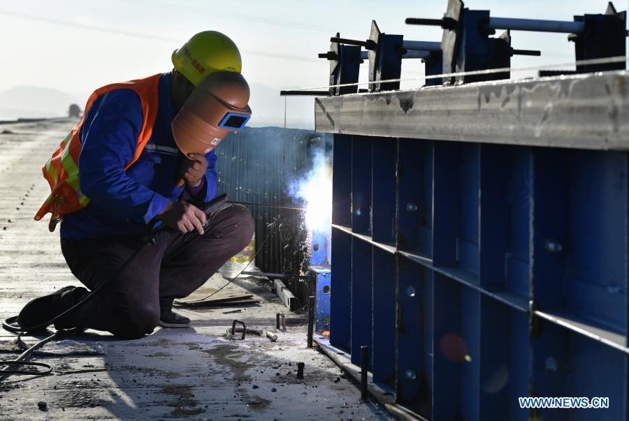 A laborer works at the construction site of Meizhou Bay cross-sea bridge of the Fuzhou-Xiamen high-speed railway in southeast China's Fujian Province, Dec. 2, 2020. The 14.7-km-long bridge is part of the province's Fuzhou-Xiamen high-speed railway, the first cross-sea high-speed railway in China, which is expected to be put into operation in 2022. (Xinhua/Wei Peiquan)