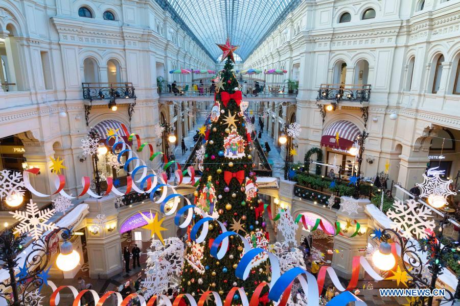 New Year decorations are seen in the GUM department store near Red Square in Moscow, Russia, on Dec. 2, 2020. (Xinhua/Bai Xueqi)