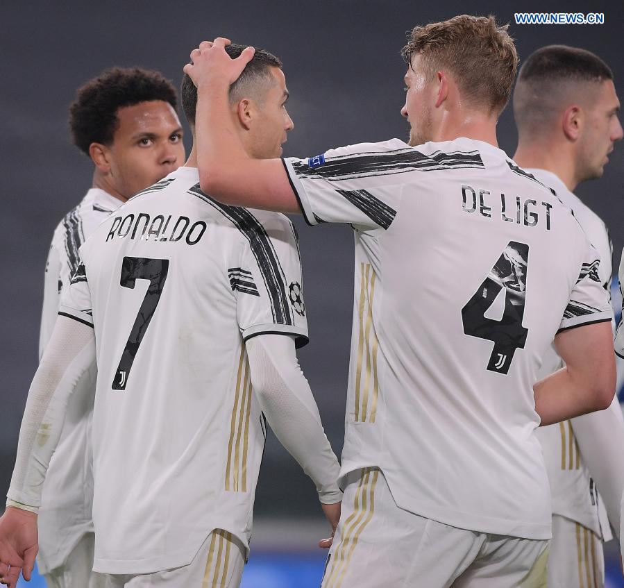 FC Juventus's Cristiano Ronaldo (2nd L) celebrates his goal with his teammates during the UEFA Champions League Group G match between FC Juventus and Dynamo Kyiv in Turin, Italy, Dec. 2, 2020. (Photo by Federico Tardito/Xinhua)