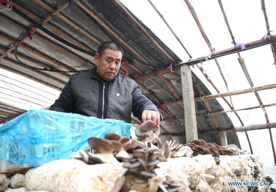 A farmer picks oyster mushrooms in a green house in Dongfeng Village of Quzhou County, north China's Hebei Province, Dec. 3, 2020. (Xinhua/Zhu Xudong)
