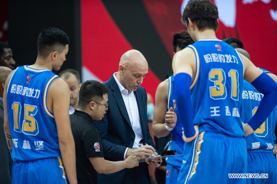 Nenad Vucinic (C), head coach of Fujian Sturgeons, instructs during the 13th round match between Zhejiang Lions and Fujian Sturgeons at the 2020-2021 season of the Chinese Basketball Association (CBA) league in Zhuji, east China's Zhejiang Province, Dec. 3, 2020. (Xinhua/Jiang Han)