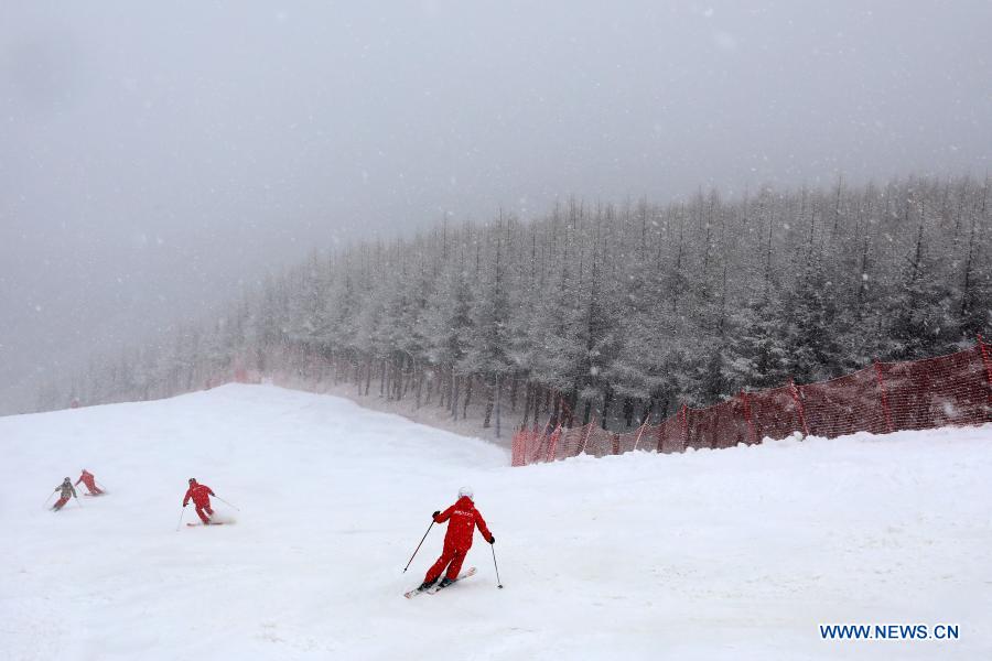 People ski at a ski field during a snowfall in Chongli District of Zhangjiakou City, north China's Hebei Province, Nov. 18, 2020. (Photo by Wu Diansen/Xinhua)