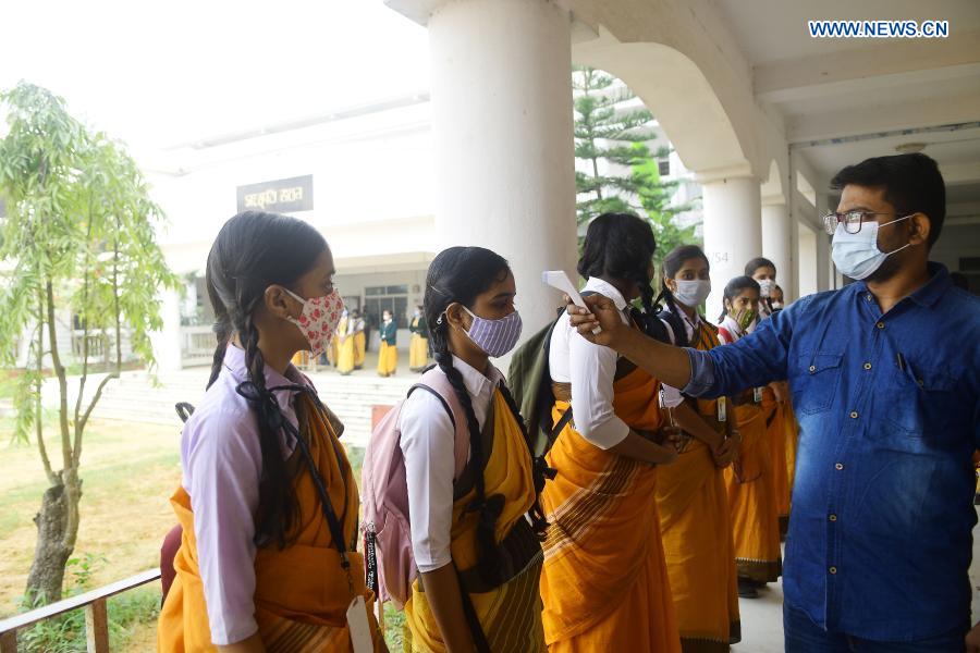 Students have temperature checked before entering classroom on the first school day at Agartala, the capital city of India's northeastern state of Tripura, Dec. 7, 2020. Tripura government has allowed schools to function from Monday with strict adherence to the norms issued by the Ministry of Health and Family Welfare in view of the pandemic. (Str/Xinhua)