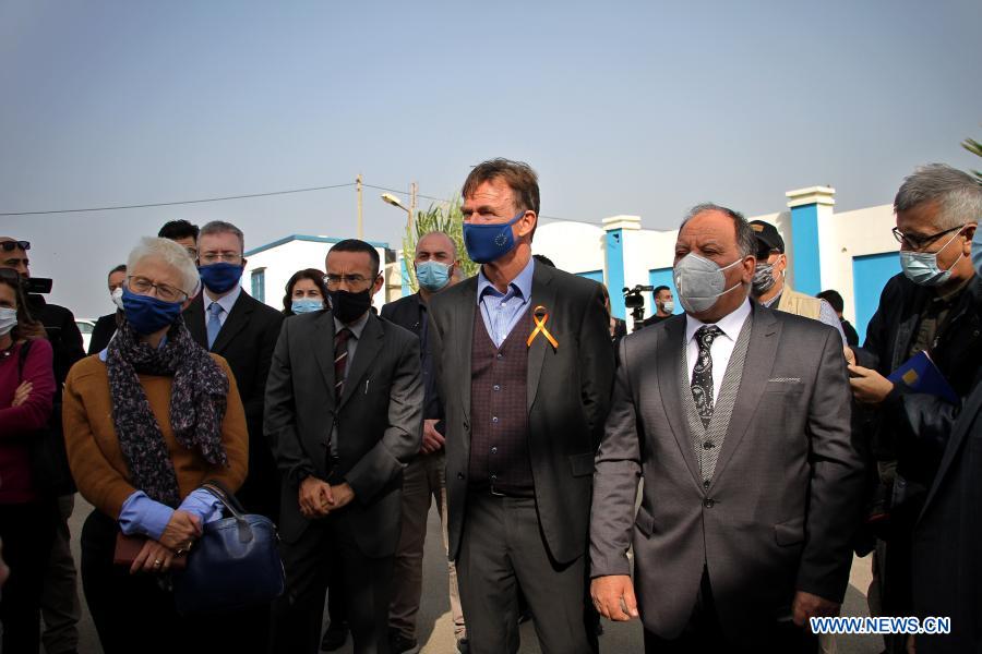 Members of an EU delegation to Gaza visit a desalination plant in Deir al-Balah city in the central Gaza Strip, Dec. 8, 2020. An EU delegation said on Tuesday that the EU will provide necessary medical gear for COVID-19 tests in the Gaza Strip and work to deliver vaccines to the besieged enclave once they are available. (Photo by Rizek Abdeljawad/Xinhua)