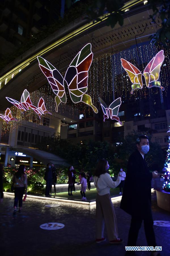 People take pictures of the light installation on Lee Tung Street in Wan Chai, Hong Kong, south China, Dec. 8, 2020. Recently, a large AI light installation themed "Butterflies of Hope" was unveiled on Lee Tung Street, Wan Chai, with the light changing according to time, weather, temperature and humidity. (Xinhua/Lo Ping Fai)