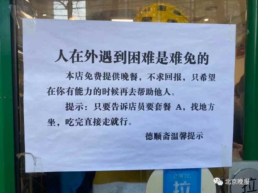 Recently a special notice with the message posted above the door of a snack bar near Sanyuan Bridge, in Chaoyang district of Beijing, has warmed the hearts of many people.