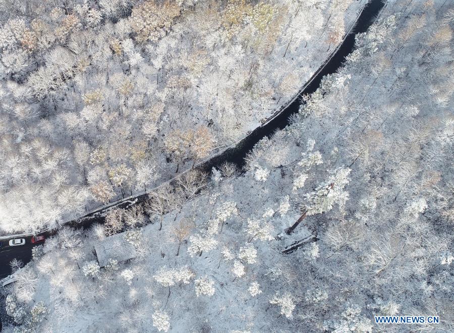 Aerial photo taken on Dec. 14, 2020 shows the snow scenery of the Dong'an Forest Park in Chaohu City, east China's Anhui Province. Snow has fallen in many parts of the country in recent days. (Photo by Ma Fengcheng/Xinhua)