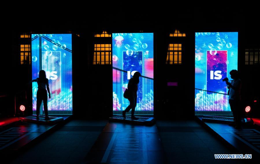 Tourists visit the "Awakening Bangkok" lighting installation fest in Bangkok, Thailand, Dec. 15, 2020. (Xinhua/Zhang Keren)