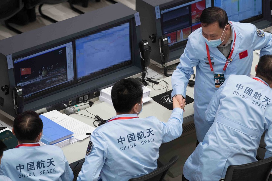 Technical personnel shake hands to celebrate the landing of the return capsule of China's Chang'e-5 probe at Beijing Aerospace Control Center in Beijing, capital of China, Dec. 17, 2020. (Xinhua/Jin Liwang)