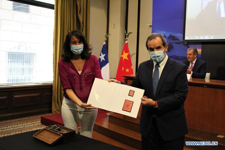 Chilean Foreign Minister Andres Allamand (R) shows commemorative stamps to mark the 50th anniversary of diplomatic relations between Chile and China in Santiago, Chile, Dec. 15, 2020. A ceremony marking the 50th anniversary of diplomatic relations between Chile and China was held on Tuesday in Santiago. (Xinhua)