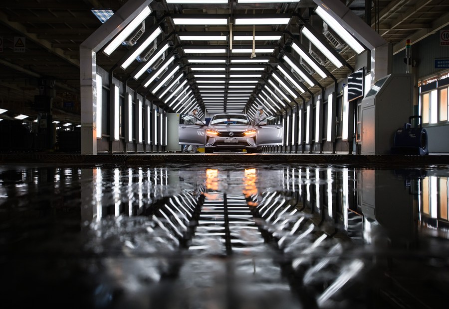 Workers are seen on the production lines at the workshop of Dongfeng Passenger Vehicle Company in Wuhan, Central China's Hubei province, March 24, 2020. [Photo/Xinhua]