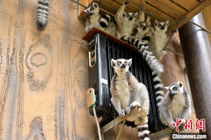 Ring-tailed lemurs sit around an electric oil heater. (Photo/Yu Jing)