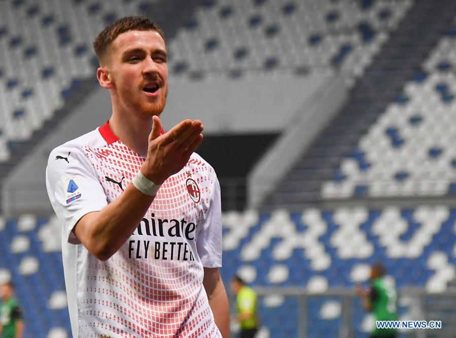 AC Milan's Alexis Saelemakers celebrates during a Serie A football match between Sassuolo and AC Milan in Reggio Emilia, Italy, Dec. 20, 2020. (Photo by Alberto Lingria/Xinhua)