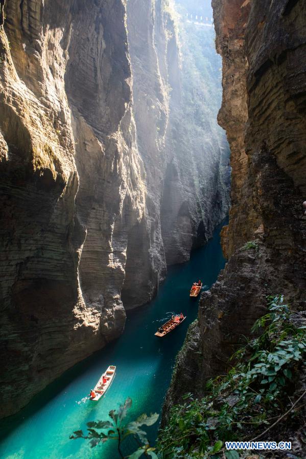 Tourists visit a canyon in Pingshan Village in Hefeng County, central China's Hubei Province, Dec. 21, 2020. Winter Solstice, the shortest day of the year, falls on Dec. 21 this year. (Photo by Tan Tao/Xinhua)