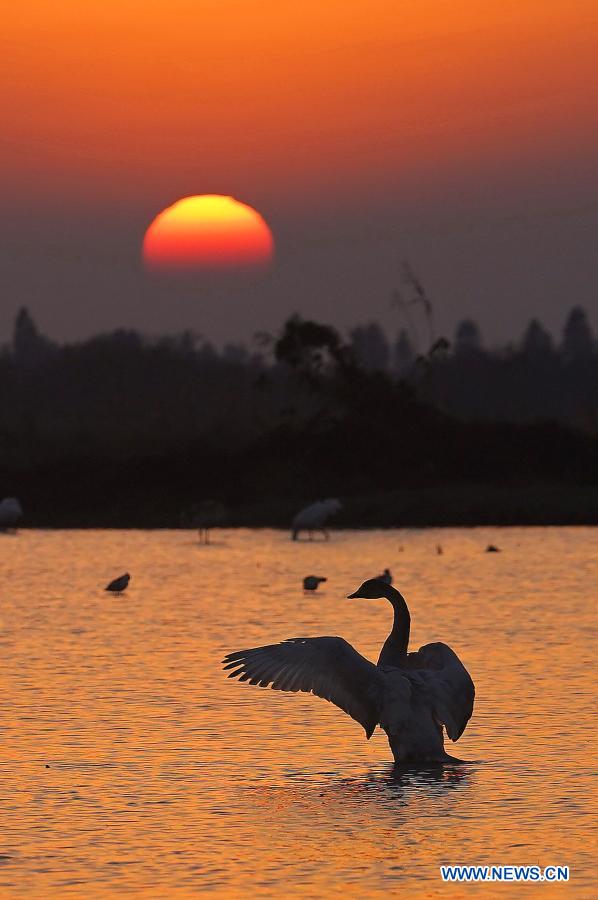 Flocks of migratory birds forage in the wetland of the Wuxing white crane conservation area by the Poyang Lake in Nanchang, east China's Jiangxi Province, Dec. 21, 2020. Numerous migratory birds including white cranes and swans have arrived in the wetland by the Poyang Lake, taking it as their winter habitat. (Xinhua/Wan Xiang)