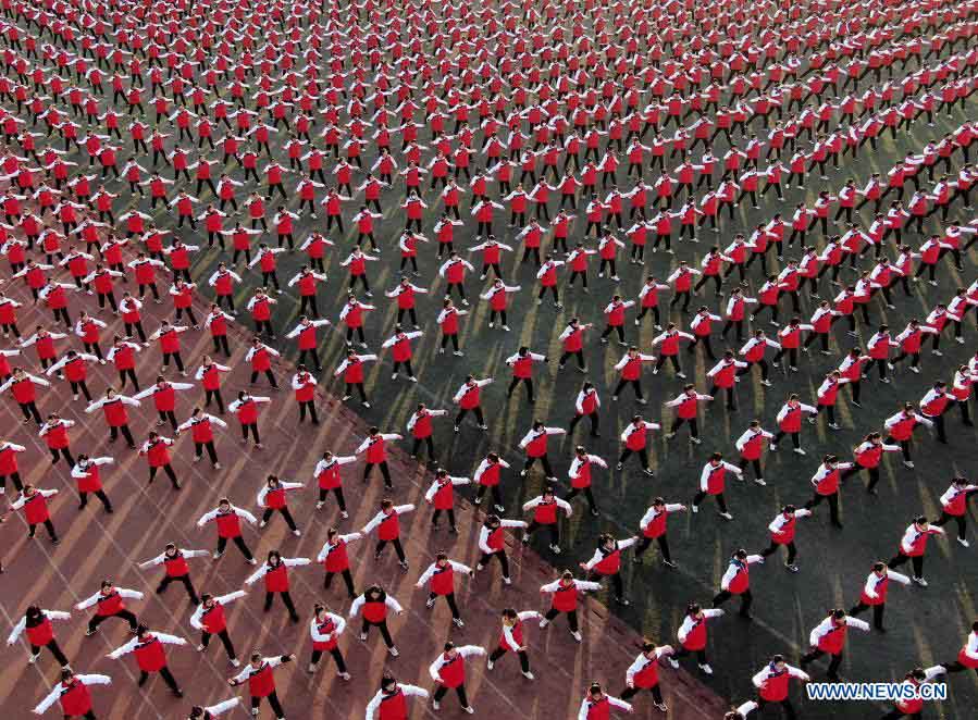 Aerial photo taken on Dec. 15, 2020 shows students practicing Taijiquan in Chenjiagou Village of Wenxian County, central China's Henan Province. The United Nations Educational, Scientific and Cultural Organization (UNESCO) inscribed China's Taijiquan on the Representative List of the Intangible Cultural Heritage of Humanity. Taijiquan, a kind of traditional martial arts, was born in the mid-17th century in a small village named Chenjiagou located in Central China's Henan province, before it spread to more than 150 countries and regions, attracting more than 100 million people to practice. The village Chenjiagou has dozens of Taijiquan schools and more than 800 current masters, drawing learners all over the world. (Xinhua/Li An)