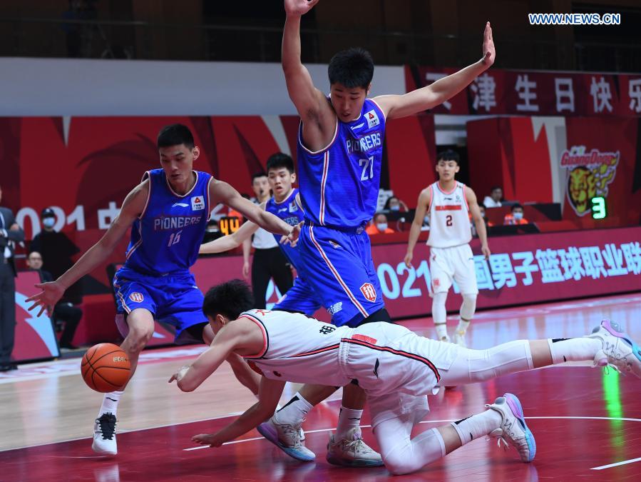 Hu Mingxuan (front) of Guangdong Southern Tigers competes during the 22nd round match between Tianjin Pioneers and Guangdong Southern Tigers at the 2020-2021 season of the Chinese Basketball Association (CBA) league in Zhuji, east China's Zhejiang Province, Dec. 23, 2020. (Xinhua/Zhu Zheng)