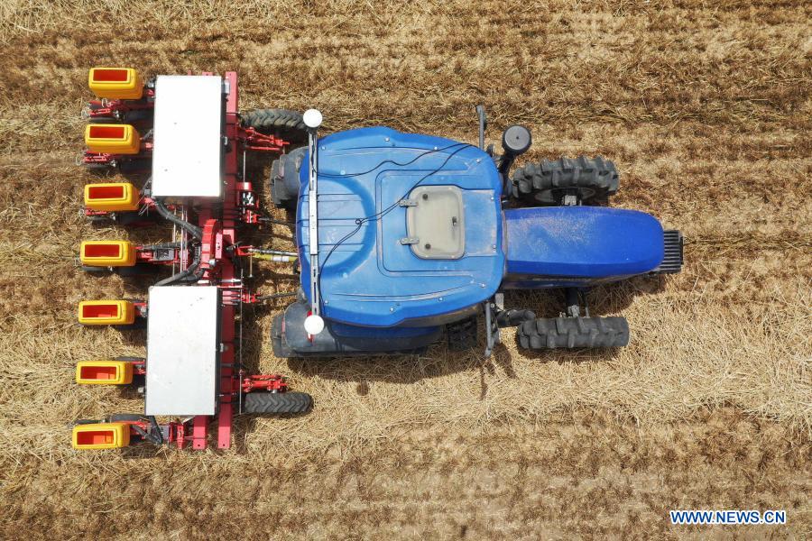 Photo taken on May 26, 2020 shows an unmanned tractor equipped with BeiDou Navigation Satellite System (BDS) sowing seeds in the field in Anzhong Village of Xiaoyangying Town in Dengzhou City, central China's Henan Province. With the development of new technologies such as the 5G, artificial intelligence and BeiDou Navigation Satellite System (BDS), unmanned technology is injecting impetus into traditional industries as well as making people's life easier and more convenient in China, and bringing about profound innovation and transformation. From commerce, agriculture, transportation, industrial production to environmental protection, China has been embracing this emerging technology in various fields in recent years as it strives to promote high-quality development. (Xinhua/Feng Dapeng)