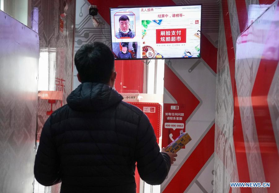 A customer scans his face to pay at a self-service supermarket in Xiong'an, north China's Hebei Province, Dec. 10, 2019. With the development of new technologies such as the 5G, artificial intelligence and BeiDou Navigation Satellite System (BDS), unmanned technology is injecting impetus into traditional industries as well as making people's life easier and more convenient in China, and bringing about profound innovation and transformation. From commerce, agriculture, transportation, industrial production to environmental protection, China has been embracing this emerging technology in various fields in recent years as it strives to promote high-quality development. (Xinhua/Yin Gang)