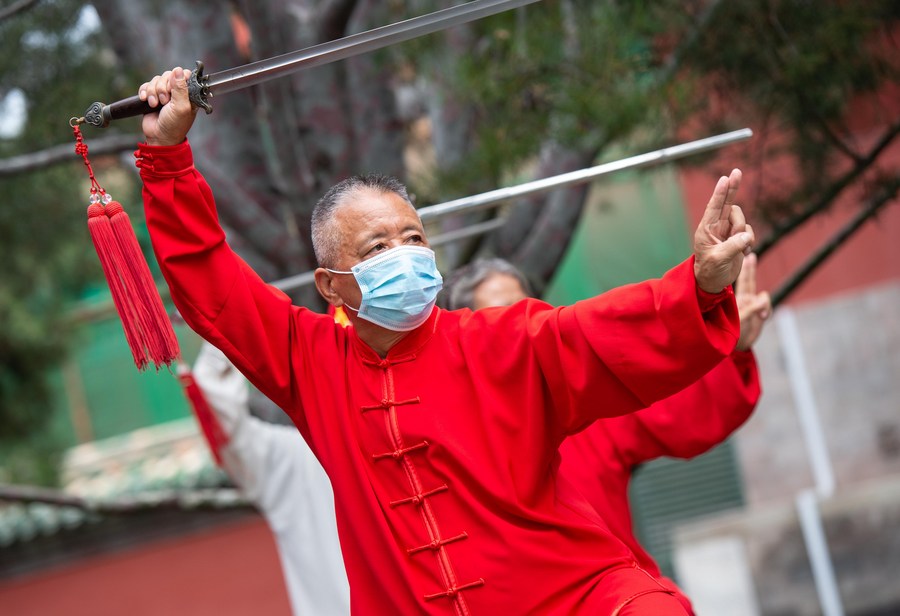 Zhang Liangui, 68, practices Taiji Sword at the Temple of Heaven Park in Beijing. (Xinhua/Meng Tao)