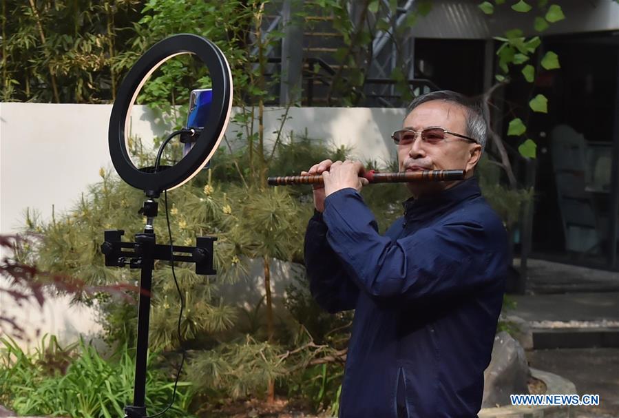 Li Julong, 69, makes an instructional video about playing the flute for senior residents living in the neighborhood of Fusi Community in Beijing. (Xinhua/Peng Ziyang)