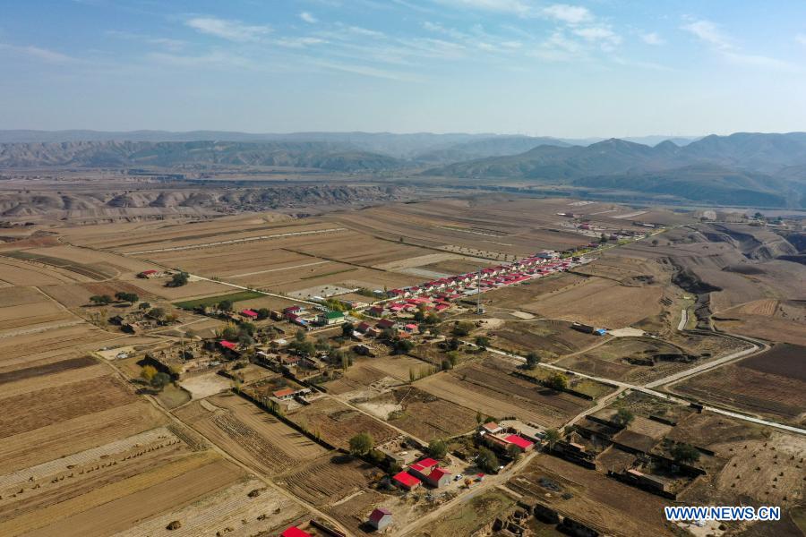 Aerial photo taken on Oct. 28, 2020 shows the new buildings at Hejiayuan Village of Xihaigu in northwest China''s Ningxia Hui Autonomous Region. Xihaigu, a largely mountainous region in northwest Ningxia, was once inflicted by deep poverty and labeled the "most unfit place for human settlement" by the United Nations in the 1970s due to land reclamation, drought, and a fragile ecological environment. On Nov. 16, 2020, Xihaigu historically bid farewell to absolute poverty, during which "she power" played an indispensable role. Ding Haiyan, 55, is chairwoman of the trade union of water supplies bureau of Wuzhong City in Ningxia. She transferred to Hejiayuan Village in Yuwang Township of draught-haunted county of Tongxin in central Ningxia in 2015 starting her new career as a poverty alleviation cadre. To Ding''s great disappointment, most villagers there were seniors or the disabled who had no access to paved roads and electric power for industrial purposes, and little confidence in her will and power. Despite these, Ding insisted on making door-to-door visits to get her head around the basic situation there. She came up with a two-pillar strategy to simultaneously improve villagers'' income and infrastructure in the village. She also tailored individual poverty-alleviation plans for each household in the village. Started with livestock breeding, villagers had more and more confidence in Ding as they saw steadily increasing income. Ding also managed to multiply the villagers'' sources of income by encouraging production of specialty grains like millet and buckwheat. Thanks to her efforts, a paved road was also accomplished to bring output of the village to wider markets. Looking at an almost ready canteen for senior citizens, the last one of her promises to the villagers in Hejiayuan, Ding admitted that she occasionally shed tears due to the difficulties she had to confront, but she would never forget the villagers'' eyes with expectation and her responsibility for them. (Xinhua/Feng Kaihua)