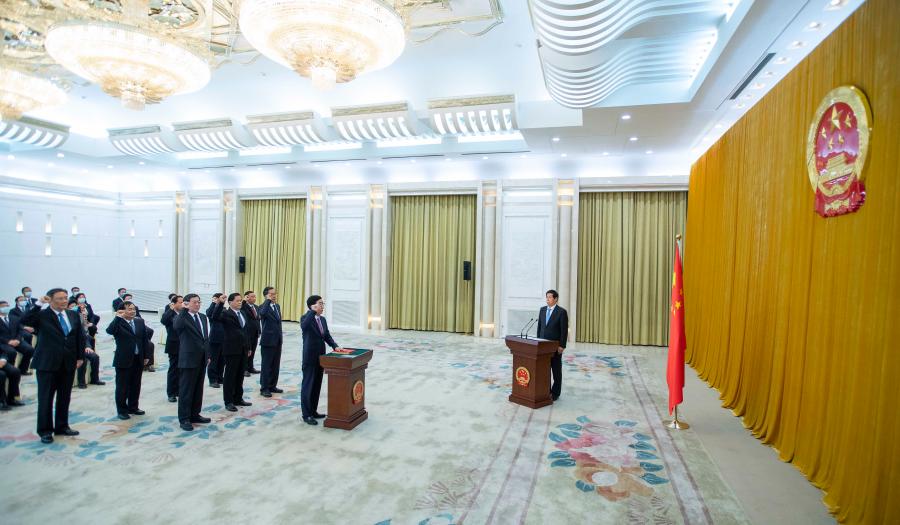 Li Zhanshu, chairman of the National People's Congress (NPC) Standing Committee, presides over an oath-taking ceremony held by the 13th NPC Standing Committee to pledge allegiance to the Constitution at the Great Hall of the People in Beijing, capital of China, Dec. 26, 2020. (Xinhua/Li Tao)
