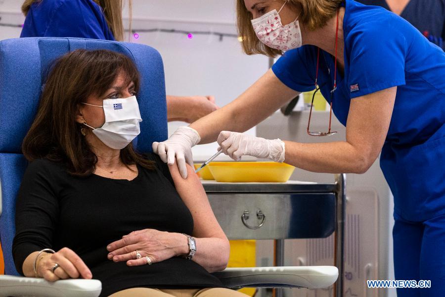 Greek President Katerina Sakellaropoulou (L) receives a dose of COVID-19 vaccine at the Evaggelismos Hospital in Athens, Greece, Dec. 27, 2020. (Pool via Xinhua)