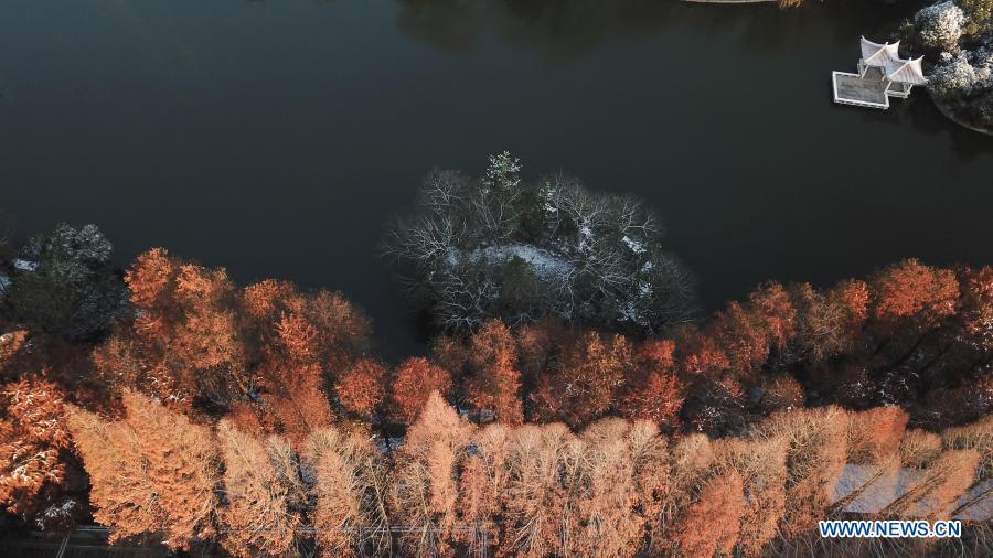 Aerial photo taken on Dec. 30, 2020 shows the snow view at Huancheng Park in Hefei, capital of east China's Anhui Province. (Xinhua/Zhang Duan)