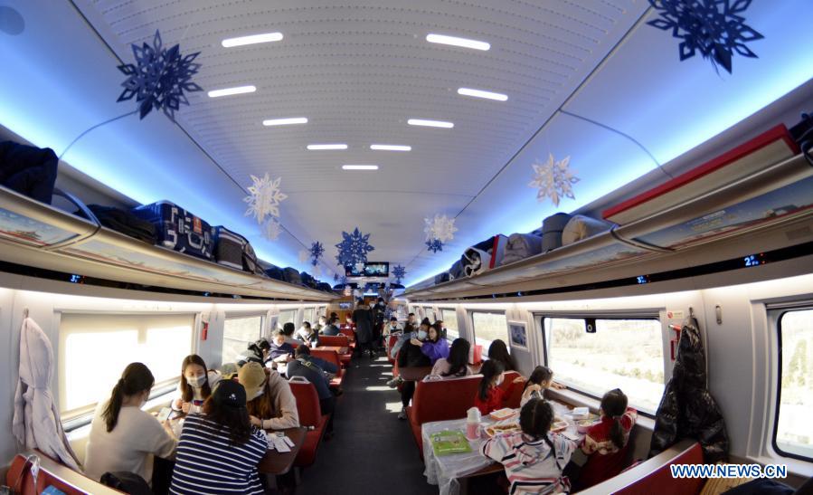 Photo taken on Dec. 29, 2020 shows snowflake-shaped decorations on a train of the Beijing-Zhangjiakou high-speed railway line. The railway line has received more than 6.8 million passengers since it was put into service on Dec. 30, 2019. (Xinhua/Li Xin)