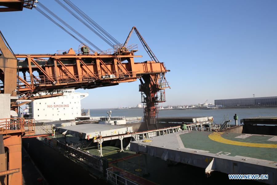 A freight ship loads cargos at Huanghua Port in Cangzhou City, north China's Hebei Province, Dec. 30, 2020. By Dec. 29, 2020, the annual throughput of Huanghua Port has reached over 300 million tons, with a year-on-year increase of 5.17 percent. (Photo by Yuan Liwei/Xinhua)