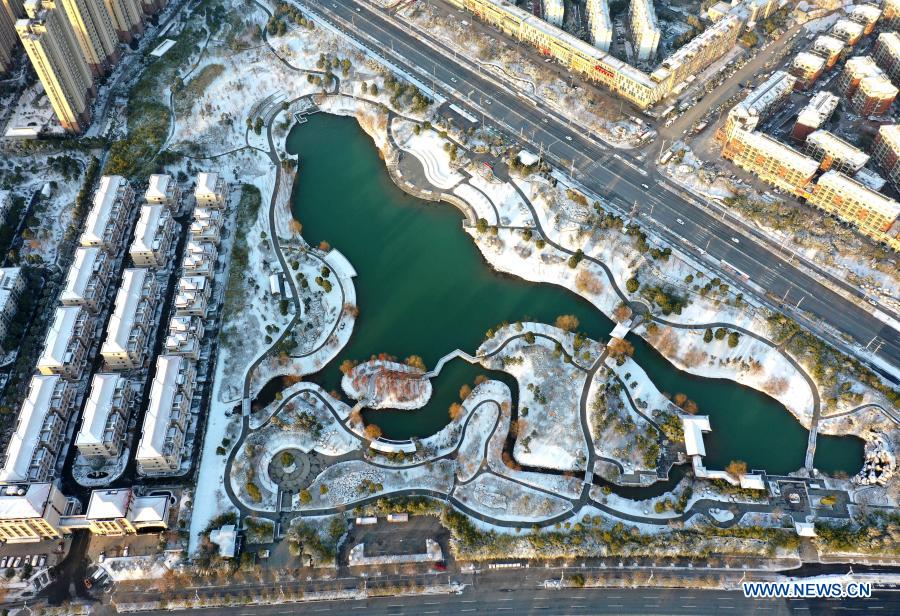 Aerial photo taken on Dec. 30, 2020 shows the snow scenery at a park in Quanjiao County of Chuzhou City, east China's Anhui Province. (Photo by Shen Guo/Xinhua)