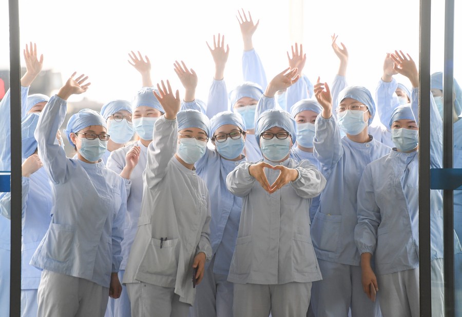 Medical staff of Wuhan No. 1 Hospital gesture to bid farewell to medics from Guangdong Province before their departure from Wuhan Tianhe International Airport in Wuhan, central China's Hubei Province, March 23, 2020. (Xinhua/Chen Yehua)
