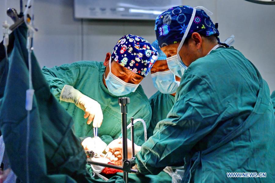 Doctors operate on a hydatid disease patient at Lhasa People's Hospital in Lhasa, capital of southwest China's Tibet Autonomous Region, Dec. 31, 2020. Hydatid disease, or echinococcosis, a parasitic disease caused by tapeworm, is a problem for residents of herding areas in western China. Without treatment, the death rate of the disease is as high as 94 percent. As a major pastoral area, Tibet Autonomous Region reports one of the world's highest frequencies of echinococcosis infections. The disease had been a major cause of poverty for many rural residents in Tibet. To contain transmission of the disease, around 500 medical experts from across the country have been sent to the region since 2016. Together with 3,000 medical support staff, they investigated every household in the region. Any patient diagnosed with hydatid disease now benefit from free care at designated hospitals across the region. A total of 5,057 patients have received surgery over the past four years. Thanks to thorough screening and free treatment, the disease is now effectively contained. The incidence rate of hydatid disease in Tibet has dropped from 1.66 percent in 2016 to 0.26 percent, according to the regional hydatid disease control and prevention office. (Xinhua/Zhang Rufeng)