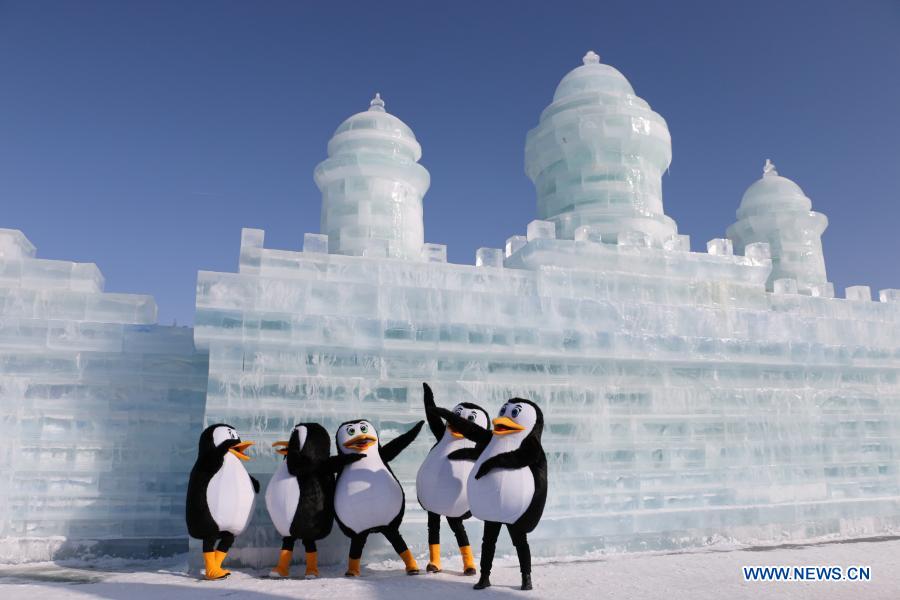 Performers in penguin costumes are seen in front of an ice sculpture in Datan Town, Fengning Manchu Autonomous County, north China's Hebei Province, Jan. 1, 2021. (Photo by Liu Huanyu/Xinhua)