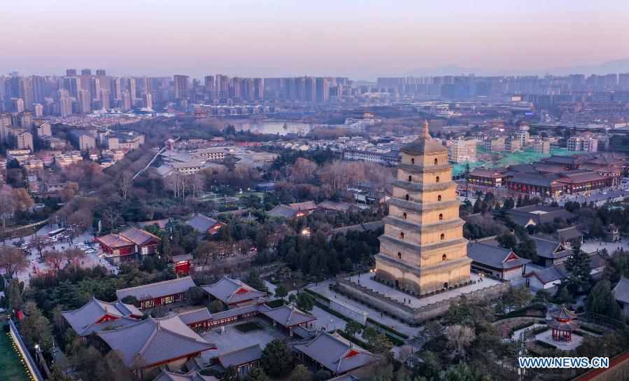 Aerial photo taken on Jan. 1, 2021 shows the sunset scenery of Dayan Pagoda in Xi'an, northwest China's Shaanxi Province. (Xinhua/Tao Ming)