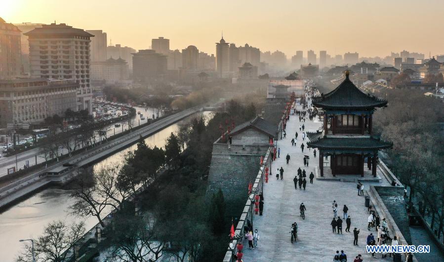 Aerial photo taken on Jan. 1, 2021 shows people visiting the ancient city wall at sunset in Xi'an, northwest China's Shaanxi Province. (Xinhua/Tao Ming)