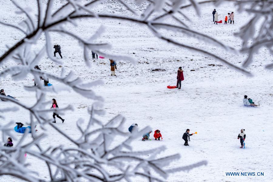 People have fun in the snow covered Jinfo Mountain in Nanchuan District of southwest China's Chongqing, Jan. 1, 2021. (Photo by Qu Mingbin/Xinhua)